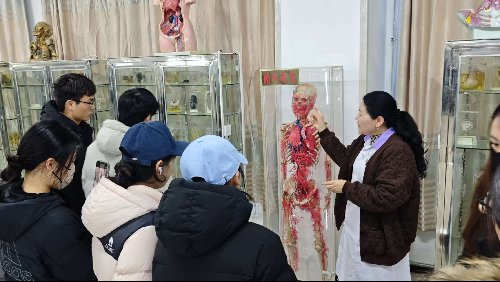 在生命科技馆,学生通过观察人体器官标本,系统理解人体结构与健康养护的科学基础,从生命科学视角认知康养旅游中“健康管理”与“身心调节”的深层内涵。随后在中草药标本馆,师生共同辨识了各类药用植物,特别是阿勒泰地区特有中草药资源,深入探讨其在中医药养生、生态康养产品开发中的独特价值与应用潜力。