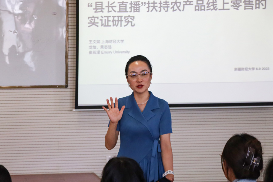 69日,我院邀请上海财经大学商学院运营管理系主任商务分析研究中心主任王文斌教授我院小组团援疆专家成员开展学术交流活动王文斌教授以《“县长直播”扶持农产品线上零售-一个基于因果机器学习的实证研究》为题作学术报告我院全体教师、研究生100人参加了报告会,学院党委副书记、院长王海芳教授主持此次学术报告会