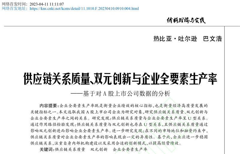 创新与战略管理系副教授热比亚·吐尔逊博士一作论文在核心期刊《价格理论与实践》[北大核心]2023年4月网络首发,题目为:供应链关系质量、双元创新与企业全要素生产率——基于对 A 股上市公司数据的分析。