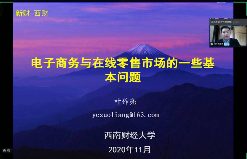 11月27日,西南财经大学国际商学院副院长叶作亮教授应我院邀请做了题为“电子商务和在线零售市场中的核心问题”的学术报告(新财商学·前沿系列之二),会议在腾讯在线会议室举行。我院教师、研究生等60余名师生参加了报告会,院长陈玉萍教授、副院长李长青联合主持了报告会。