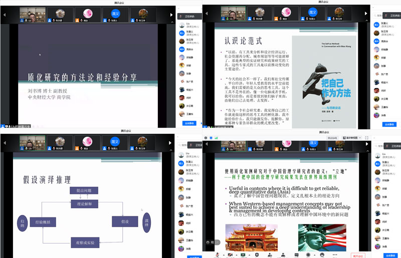 刘书博副教授从认识论范式切入主题,对质性研究的定义、质性研究与量化研究方法比较、不同的研究范式、理论构建过程、具体研究方法与技术等几个方面进行讲解,并结合领域内的论文和专著实例,同时重点基于自己的写作实例,探讨了使用质化案例研究对于中国管理学研究的意义,提出了把中国的管理学研究成果发表在世界顶级期刊的倡导和思路。