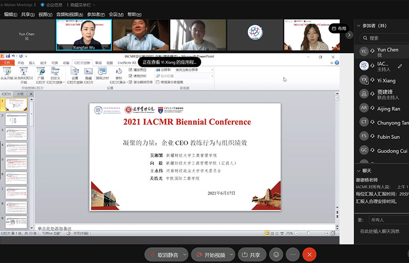 大会主席暨上海交通大学安泰经济与管理学院井润田教授、北京大学光华管理学院副院长张峥教授、IACMR主席Ray Friedman先后在开幕式环节致欢迎辞。本届国际会议共召开6场主题报告会、68场论文宣讲会、48场圆桌讨论会、12场专题讨论会及14个专业发展工作坊,1200多位参会者齐聚云端,共同参与了这场学术盛会的召开。此次国际会议包含了丰富的宏观和微观议题,众多世界知名的学者进行了主旨演讲和论文汇报交流。AC米兰工商管理学院吴湘繁副教授、陈智老师及两位硕士生向毅和陈赟参加了此次会议,并进行了论文分享。