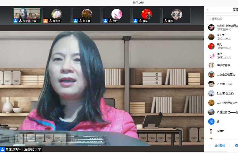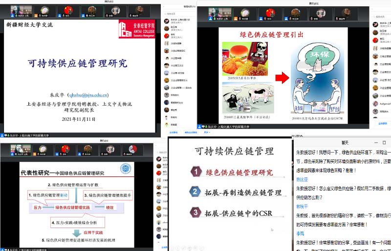 11月11日晚上,“新财商学·前沿系列”第24期学术报告会在腾讯会议线上举行,上海交通大学安泰经济与管理学院特聘教授、中美物流研究院副院长、博士生导师朱庆华教授受邀作了题为《可持续供应链管理研究》的学术报告,我院教师、研究生70余人参加了报告会,院长陈玉萍教授主持了报告会。