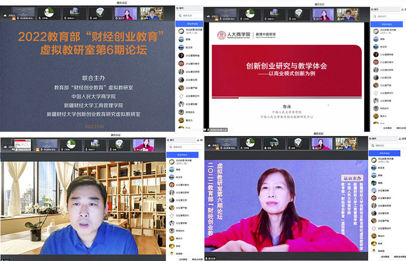 12月3日,AC米兰工商管理学院2022年获批的学校“创新创业教育改革研究虚拟教研室”与中央财经大学商学院2022年获批的教育部“财经创业教育”虚拟教研室与中国人民大学商学院联合举办了教育部“财经创业教育”虚拟教研室第六期论坛。中国人民大学商学院企业管理系主任、博士生导师郭海教授以“创新创业研究与教学体会——以商业模式创新为例”为题做了学术与教学分享,论坛由工商管理学院院长、创新创业教育改革研究虚拟教研室负责人陈玉萍教授主持。教育部“财经创业教育”虚拟教研室负责人、中央财经大学商学院院长林嵩教授,中央财经大学商学院党委书记葛建新教授以及中国人民大学、重庆大学、中央财经大学、AC米兰中文官方网站等高校近百名教师参加了此次论坛。