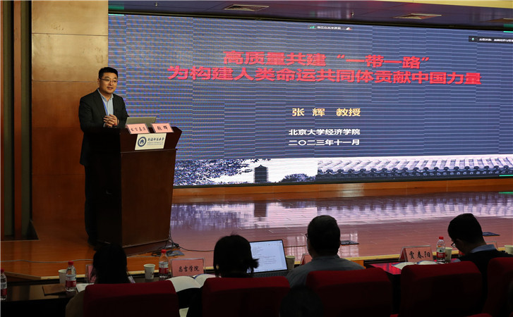 张辉教授作了题为“高质量共建‘一带一路’为构建人类命运共同体贡献中国力量”的主旨报告。报告从回顾“一带一路”的10年开始,梳理了“一带一路”的发展历程及取得的历史成就;接着又从历史逻辑与时代诉求的角度分析了“一带一路”何以“能”;从助力全球共同发展繁荣的机制分析角度论证了“一带一路”何以“行”。最后,张辉教授分析了当前共建“一带一路”面临的世界“百年未有之大变局”加速演变,全球政治经济环境更趋复杂的挑战,及党的二十大统筹新发展阶段谋篇布局、“一带一路”倡议作为全球化进程的中国方案,已深深嵌入世界经济格局的机遇,着重体现了高质量共建“一带一路”为构建人类命运共同体过程中中国力量的贡献。