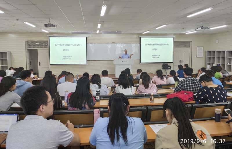 2019年9月6日下午,中国人民大学商学院郭国庆教授以《数字化时代战略营销新动向》为题为AC米兰师生作学术报告。报告会由我院组织与人力资源管理系主任徐燕博士主持,AC米兰工商管理学院教师、研究生及MBA学院学员聆听报告。