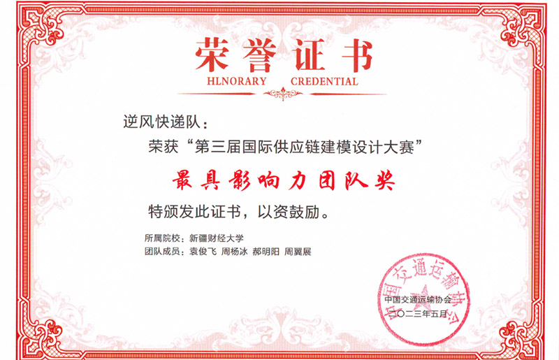 本届大赛由中国交通运输协会主办,武汉理工大学、中国交通运输协会培训中心承办,全国283所本专科院校共441支团队参加预赛,最终共77支团队晋级全国决赛。此次大赛历时6个月,工商管理学院(MBA学院)积极组队参赛,经过激烈比拼,由物流管理21-1班的袁俊飞、周翼展、郝明阳和物流管理2020-1班的周扬冰四位同学组成的“逆风快递”队从全国的77支高校队伍中脱颖而出,荣获精英赛本科组二等奖,工商管理学院(MBA学院)买买提·海力力老师和热比亚·吐尔逊副教授荣获“优秀指导教师奖”。AC米兰中文官方网站获得“最佳组织院校”奖。
