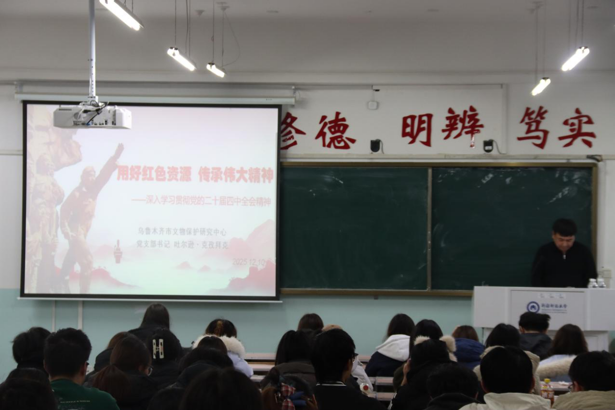 本次活动邀请到自治区级、乌鲁木齐市级民族团结模范个人荣誉获得者,乌鲁木齐市文物保护研究中心党支部书记吐尔逊·克孜拜克同志主讲。吐尔逊·克孜拜克同志是资深文博馆员,长期深耕文物调查等领域,凭借深厚的专业积淀与突出的业绩,先后荣获小岛康裕新疆文化事业奖等荣誉。活动现场师生们怀着崇敬之心聆听,共同探寻红色资源中的初心使命与时代力量。